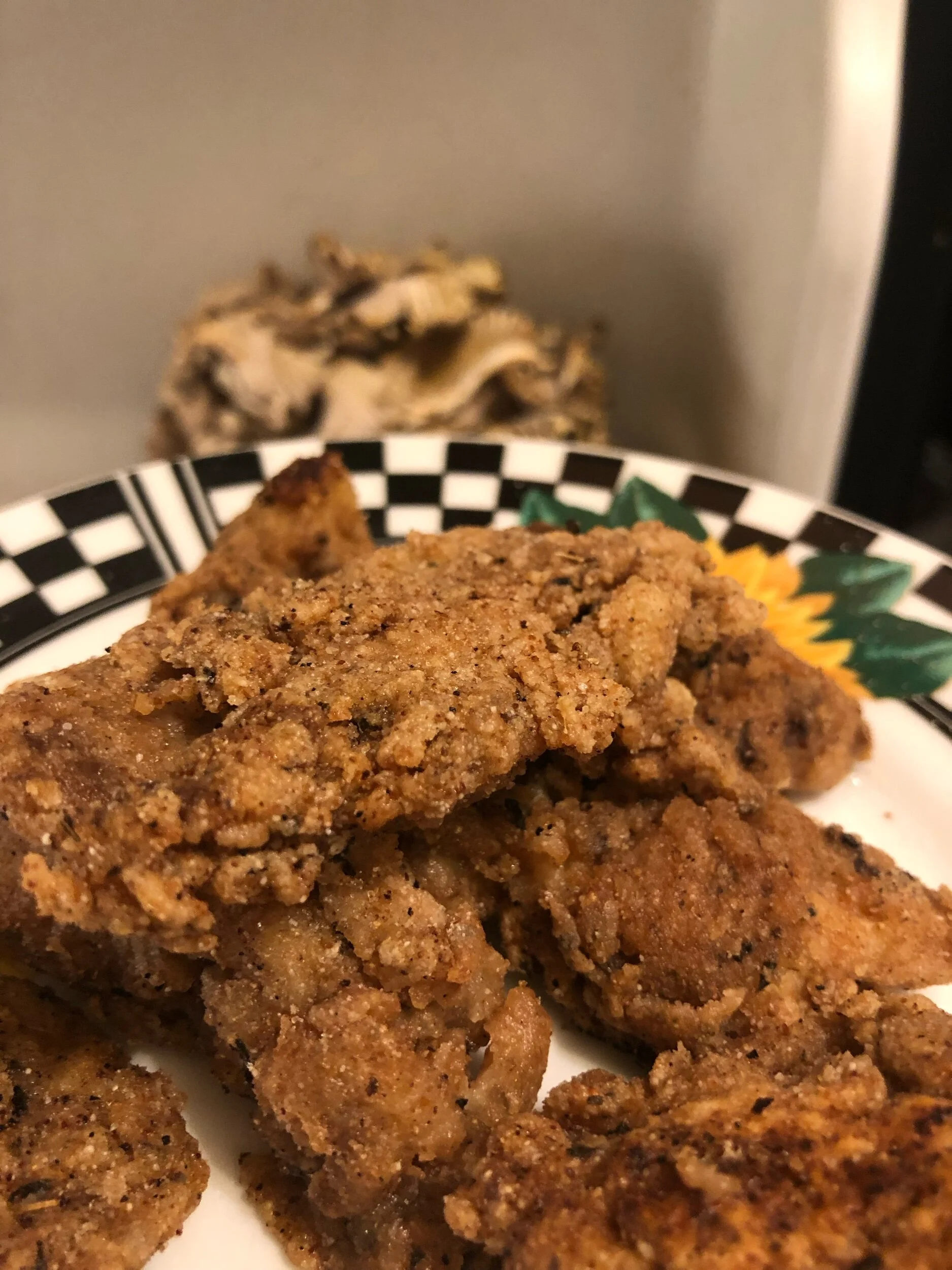 Brunch: Homemade Fried oyster mushrooms with the rest of the Mac & Cheese from the Red Bamboo.